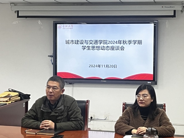 20241120日中午,城市建設與交通學院于41305會議室召開了2024年秋季學期安全教育暨學生思想動態座談會。出席本次會議的有城市建設與交通學院黨委書記張永軍、黨委副書記高喬楠、全體輔導員,以及各班團支書和班長,會議由黨委副書記高喬楠主持。