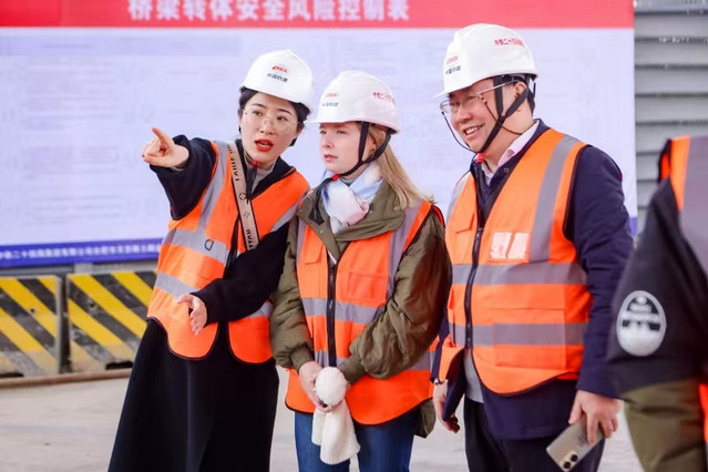 20231115日上午,城市建設與交通學院教師丁蕾、城建學院國際交換生Eva Kapshina前往中鐵二十四局文忠路上跨合肥東站項目現場參觀國內首例非對稱變寬掛籃施工轉體橋轉體施工過程。