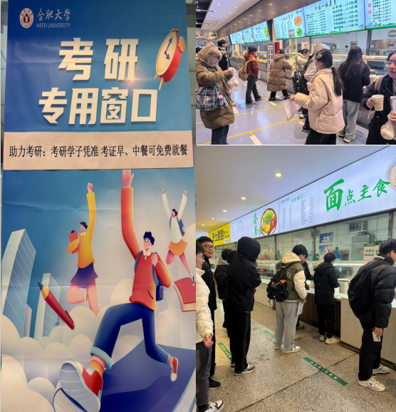 學(xué)校全力為考生提供暖心后勤保障服務(wù),食堂開(kāi)設(shè)考研專(zhuān)用窗口,考試期間免費(fèi)供應(yīng)一日三餐及暖心姜湯,提供營(yíng)養(yǎng)均衡、種類(lèi)豐富的菜品,贈(zèng)送“考研助力包”,為考研學(xué)子加油鼓勁。
