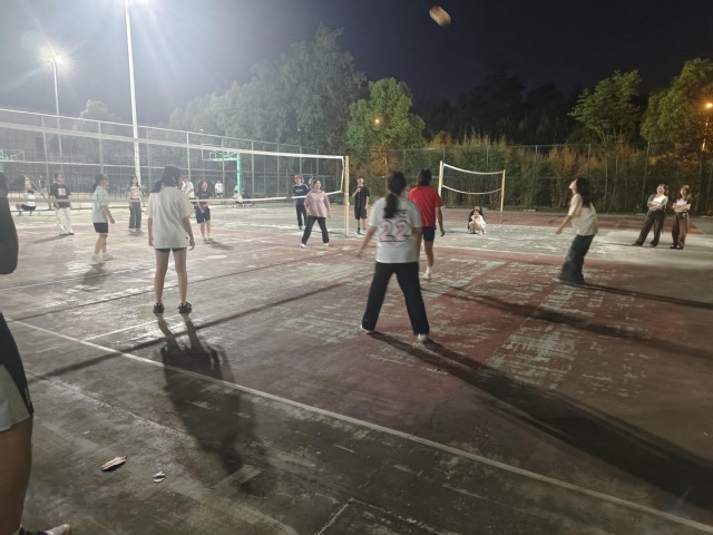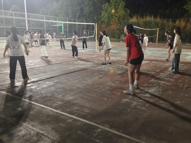 伴隨著月光,雙方運動員早已到達三期比賽場地進行熱身活動,以便更好地進入狀態。二十點整,隨著裁判到位,雙方猜拳爭奪首發球權和場地,猜拳畢,雙方進行兩球嘗試發球階段。試發結束后,在裁判的哨聲中,比賽正式開始,由經管教育聯隊首先發球。此時,場外觀眾的吶喊助威聲覆蓋了比賽現場,經管教育聯隊的運動員在觀眾們的加油助威中連續得分,逐漸占了上風。經管教育聯隊的運動員們穩扎穩打,互相配合,雖然因為緊張選手也有失誤,但總體上戰術配合良好,率先拿下賽點,最終以16:25拿下第一局。