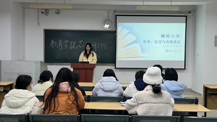 教育學院于12月18日晚20時30分在3棟302教室成功舉辦了一場主題為教育學院思政研討會的活動。此次研討會由教育學院23級思政委員聯絡代表徐錦瑤主持,23級、24級各班思政委員參加。此次研討會旨在通過交流思想來促進學生在思想政治教育方面的深入理解和實踐。