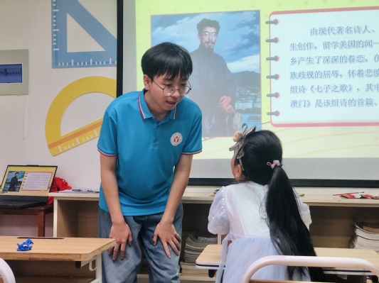 “你可知‘MACUA’不是我真姓,我離開你太久了,母親……”志愿者娓娓動(dòng)聽的歌聲響起,孩子們情不自禁地跟著志愿者打著節(jié)拍,輕聲歌唱。為了讓孩子們領(lǐng)悟這首歌曲背后雋永的情感,更好地學(xué)習(xí)這首歌,志愿者為孩子們講解了這首歌曲的創(chuàng)作背景與歌詞內(nèi)容。志愿者告訴孩子們“七子”是當(dāng)時(shí)中國(guó)被列強(qiáng)霸占的七塊土地,澳門是其中之一,詩(shī)人聞一多留學(xué)歸來,放眼祖國(guó)家園,山河破碎,斷壁殘?jiān)麘嵢粚懴轮膼蹏?guó)詩(shī)篇《七子之歌》,以抒發(fā)七子的孤苦亡告和眷懷祖國(guó)的哀忱。聽志愿者娓娓道來,孩子們不禁都紅了眼眶。山河的破碎、先輩的熱血、閃耀的紅星都仿佛出現(xiàn)在眼前。