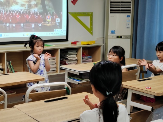 手語是一種感情的溝通,心靈的釋放,為特殊人士與世界的交流架起一座心靈的橋梁,緊緊連接著彼岸的人們。志愿者望向同學們,面帶微笑地講,“小朋友們,什么是手語呀?”聽到老師的問題,一個小朋友快速地舉起了小手,“就是有些人聽不到講話,我們可以用手來表達給他,像這樣。”說著,他便舉起小手做了一個加油的動作。其他小朋友好奇地張望著,看來小朋友們都很感興趣。同學們全神貫注,目不轉睛地盯著老師的動作,生怕一個不留神就錯過了什么。當音樂響起,同學們馬上調整好狀態,臉上掛著甜甜的笑容,隨著音樂的節奏,小手在空中舞動,志愿者向他們豎起大拇指,課堂在熱烈的掌聲中落下了帷幕。