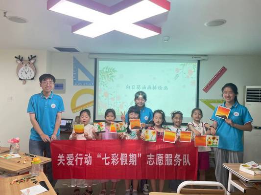 7月3日上午,合肥學院教育學院“七彩童年,‘育’你相伴”志愿團隊前往合肥市包河區(qū)濱湖和園社區(qū)開展暑期“三下鄉(xiāng)”社會實踐活動。高凡、尹冰清兩位志愿者共同為孩子們帶來了一堂美術課,課程內容主要是用油畫棒繪制向日葵。