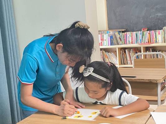 人生是一幅五彩繽紛的畫,而童年是畫中最美的地方七八歲的孩子們就像一朵朵盛開的向日葵,充滿著朝氣與希望。志愿者以此為主題,引導孩子們繪制出屬于自己的向日葵。課程伊始,志愿者先給孩子們展示這堂課繪畫的參照圖—一朵色彩鮮艷的向日葵,接著分發(fā)繪畫所需的紙張和各色的油畫棒。一切工作準備就緒后,志愿者開始逐步講解繪制向日葵的方法,即先將膠布粘貼在畫紙的四周,再用棕色的油畫棒畫兩個圓圈……孩子們跟著志愿者小心翼翼地用油畫棒細細涂抹,輕輕地用紙巾暈染顏色。