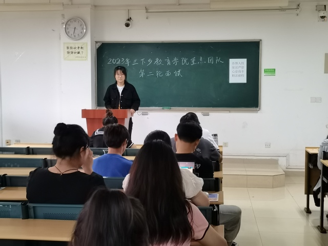 為進(jìn)一步強(qiáng)化實(shí)踐育人專業(yè)性、針對(duì)性和實(shí)效性,教育學(xué)院于5月14日,在3棟301教室舉行了2023年暑期“三下鄉(xiāng)”教育學(xué)院重點(diǎn)團(tuán)隊(duì)第二輪面試。本次活動(dòng)由教育學(xué)院團(tuán)委學(xué)生會(huì)組織部主辦,團(tuán)委學(xué)生兼職副書(shū)記程雨彤、四兆琦,組織部部長(zhǎng)李艾錦作為面試官出席活動(dòng)。