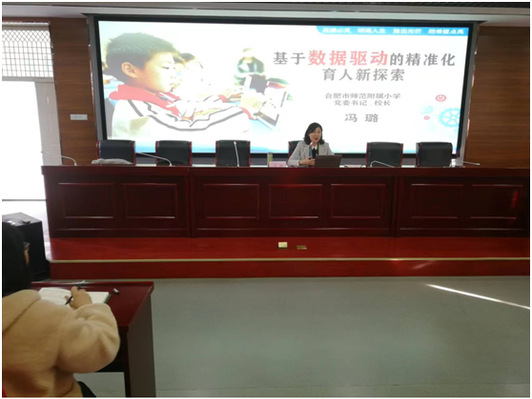馮璐校長主要向師生們介紹了合肥師范附小聚焦五育并舉視域下的學校評價改革、利用數字技術助力學校的課堂評價、學生綜合素質個性化評價等方面做出的精準化育人新探索。重點探討了為什么需要數據驅動“精準化育人”、 數據技術如何賦能日常學習、如何繪制個性化圖譜驅動精準育人等三個方面問題。報告會得到了與會人員的高度贊同和認可。