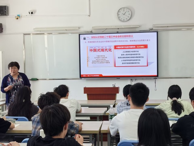 首先,李秀娟深入闡述了黨的二十屆三中全會(huì)的主題和重要意義。她指出,全會(huì)聚焦全面深化改革,明確了新時(shí)代改革的方向和任務(wù),為推動(dòng)國(guó)家發(fā)展提供了重要指引。她強(qiáng)調(diào),全會(huì)的指導(dǎo)思想是堅(jiān)持以習(xí)近平新時(shí)代中國(guó)特色社會(huì)主義思想為指導(dǎo),立足新發(fā)展階段,貫徹新發(fā)展理念,構(gòu)建新發(fā)展格局,推動(dòng)高質(zhì)量發(fā)展。隨后,李秀娟進(jìn)一步講解了全面深化改革的總目標(biāo)和重大原則。她指出,總目標(biāo)是完善和發(fā)展中國(guó)特色社會(huì)主義制度,推進(jìn)國(guó)家治理體系和治理能力現(xiàn)代化。同時(shí),改革必須堅(jiān)持黨對(duì)改革的集中統(tǒng)一領(lǐng)導(dǎo),堅(jiān)持改革沿著中國(guó)特色社會(huì)主義方向前進(jìn),堅(jiān)持社會(huì)主義市場(chǎng)經(jīng)濟(jì)改革方向,堅(jiān)持改革為了人民、依靠人民,這些原則為改革的順利推進(jìn)提供了堅(jiān)實(shí)保障。最后,李秀娟著重強(qiáng)調(diào)了大學(xué)生在貫徹落實(shí)黨的二十屆三中全會(huì)精神中的責(zé)任與使命,要深刻理解習(xí)近平總書(shū)記提出的“六個(gè)力”的豐富內(nèi)涵,即思政引領(lǐng)力、人才競(jìng)爭(zhēng)力、科技支撐力、民生保障力、社會(huì)協(xié)同力、國(guó)際影響力,要求全體需要圍繞這“六個(gè)力”深入思考,深刻領(lǐng)悟全會(huì)精神,將個(gè)人理想融入國(guó)家發(fā)展大局,努力學(xué)習(xí)科學(xué)文化知識(shí),提高自身綜合素質(zhì),積極投身社會(huì)實(shí)踐,為實(shí)現(xiàn)中國(guó)式現(xiàn)代化貢獻(xiàn)自己的力量。