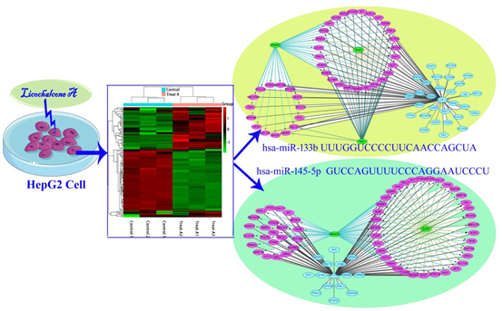 甘草Glycyrrhiza是一類豆科植物,作為一種天然甜味劑廣泛應用于食品行業,同時也是一種傳統中藥材,屬于藥食同源類食品。甘草查爾酮A是一種從甘草根部提取出來的黃酮類化合物,具有緩解哮喘、抑制肥胖、清除自由基和抗癌等多種生理活性。值得注意的是,越來越多的研究報告表明,甘草查爾酮A對多種癌細胞具有抑制作用,如胃癌細胞MKN-28和MKN-45、前列腺癌細胞PC-3、骨肉瘤細胞HOS和MG-63、肺癌細胞A549和H460、乳腺癌細胞和肝癌細胞HepG2。然而,甘草查爾酮A基于miRNA組學的抗癌機制尚未明確。