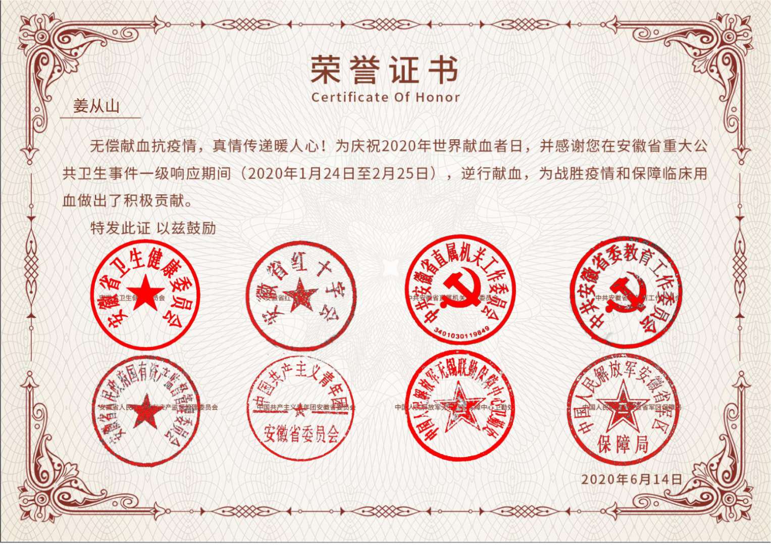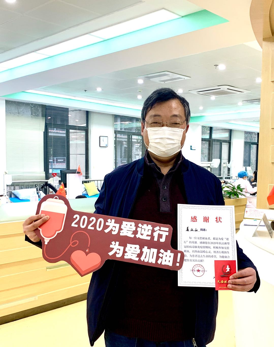 熟悉姜從山老師的人都知道,獻血這件事對他來說早就如同家常便飯一般。據(jù)姜老師說,這已經(jīng)是他的第112次獻血了。受疫情影響,全國上下的血液需求量早已告急,原定年初七復(fù)工的合肥市中心血站更是在年初一就打開了大門。但大范圍的自我隔離早已開始,獻血者數(shù)量遠遠滿足不了血站的要求。 姜老師說,他這次跟往常一樣,是來獻血小板。在他2011年至今的“獻血生涯”中,獻血小板占了大多數(shù)。和獻全血不同,獻血小板對患者更具有針對性,特別是對于白血病患者,血小板就是續(xù)命的“燃料”,與之相關(guān),對捐獻者的身體要求也更加嚴(yán)格。這次采血小板很成功,這意味著又給患者帶去了新的希望。兩次獻血小板之間要間隔14天,姜老師的下一次捐獻要等到2月13日。但他一天也不愿意耽誤。 2月13日,姜從山老師如約而至。對于這位曾經(jīng)獲得過“全國無償獻血奉獻金獎”、“合肥好人”和“安徽省無償獻血公益之星”等榮譽稱號的獻血熱心人來說,這原本是一次平常到不能再平常的獻血而已。但在新冠肺炎肆虐全國乃至全球的現(xiàn)狀之下,這一份平常的善舉也擁有了一份別樣的溫暖。 2月28日,隨著第二個14天間隔期的結(jié)束,姜從山老師再一次回到血站。這不僅僅是姜老師對自己畢生追求的獻血事業(yè)的承諾,更是對成千上萬新冠肺炎病人生命的承諾。截止到3月1日,安徽省已經(jīng)向湖北支援了六批血液。