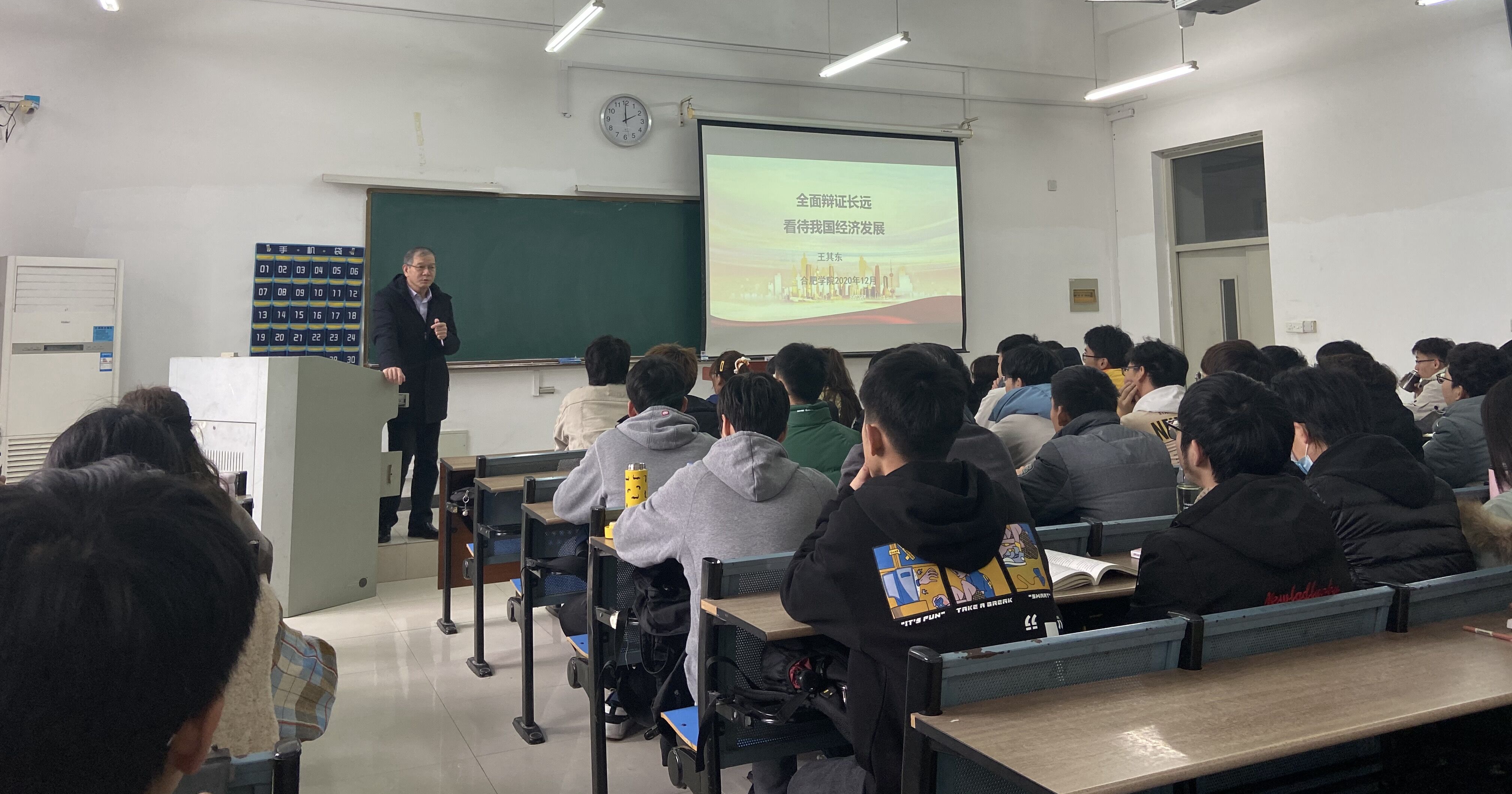 12月10日下午,校黨委書記王其東在35號樓,以“全面辯證長遠看待我國經濟發展”為題,為19級能源化學與工程、無機非金屬材料與工程、化學工程與工藝專業學生上《形勢與政策課》,受到同學們的熱烈歡迎。