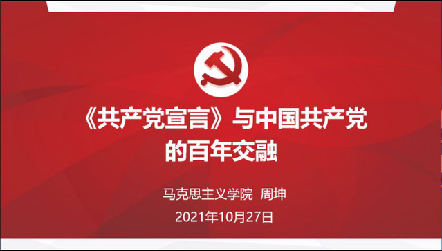 1027日,經濟與管理學院第五期全體入黨積極分子通過線上方式參與第七課《共產黨宣言與中國共產黨的百年交融》的學習。本次黨課由馬克思主義學院周坤老師主講。