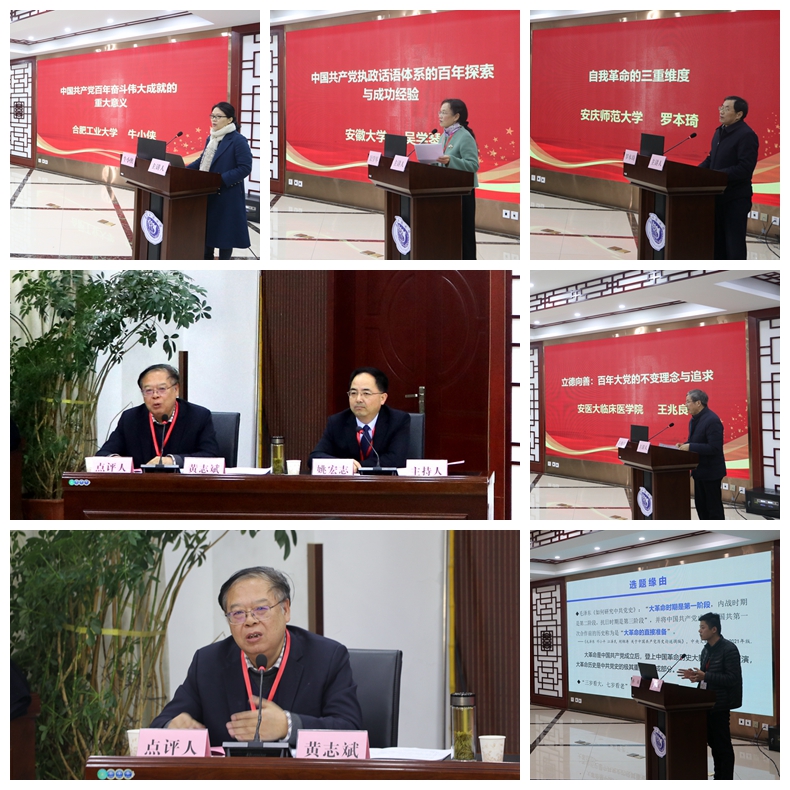 下午,學會進入主旨發言階段,第一場主旨發言由安徽師范大學馬克思主義學院院長姚宏志教授主持。合肥工業大學馬克思主義學院院長牛小俠教授圍繞《中國共產黨百年奮斗偉大成就的重大意義》、安徽大學馬克思主義學院院長吳學琴教授圍繞《中國共產黨執政話語體系的百年探索與成功經驗》、安慶師范大學馬克思主義學院院長羅本琦教授圍繞《自我革命的三重維度》、安徽醫科大學臨床醫學院馬克思主義學院院長王兆良教授圍繞《立德向善:百年大黨的不變理念與追求》、安徽文達信息工程學院馬克思主義學院黨支部書記孫碩副教授圍繞《大革命中的中國共產黨》進行主題發言。合肥工業大學馬克思主義學院教授黃志斌對五位老師的發言進行精彩點評。