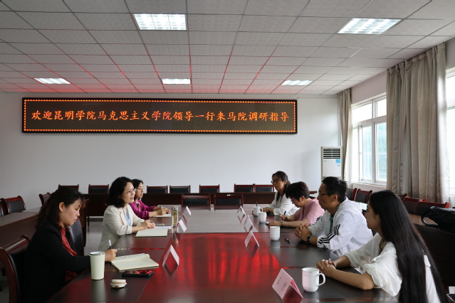 2023年66日,昆明學院馬克思主義學院陳嘉院長一行四人來我院調研交流,我院副院長、直屬黨支部書記蘇冰、教學辦主任王芳和秦莉莉老師在院會議室熱情接待了來訪的馬院同仁