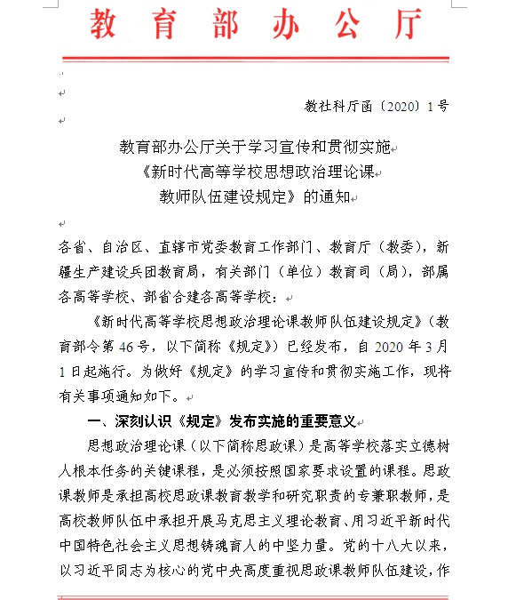 教育部辦公廳關于學習宣傳和貫徹實施《新時代高等學校思想政治理論課教師隊伍建設規定》的通知(教社科廳函〔2020〕1號)
