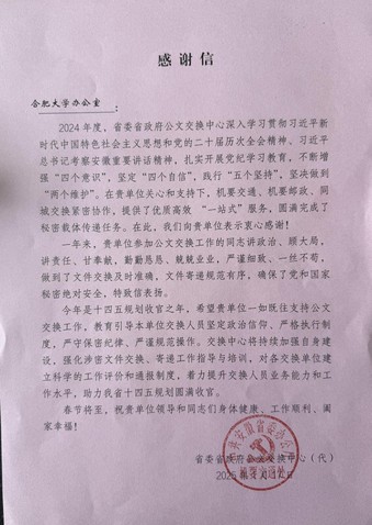 2025年初,我校收到了省委省政府公文交換中心的感謝信。信中,省委省政府公文交換中心對我校黨政辦公室全年的公文交換工作致以衷心感謝。2024年,我校黨政辦公室在公文交換工作上,做到了文件交換及時準確,文件寄遞規范有序,確保了黨和國家秘密絕對安全。新的一年,校黨政辦將嚴格執行制度、嚴守保密紀律、嚴謹規范操作,為學校高質量發展提供堅實支撐。 (黨政辦公室)初審: 趙娟 復審: 張偉頎 終審: 汪文忠