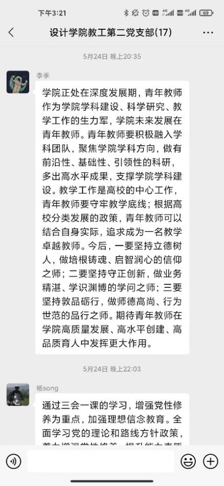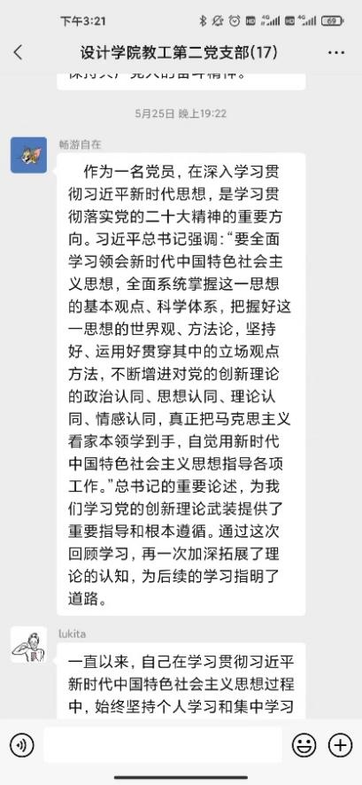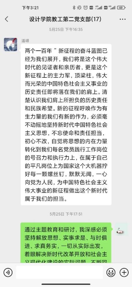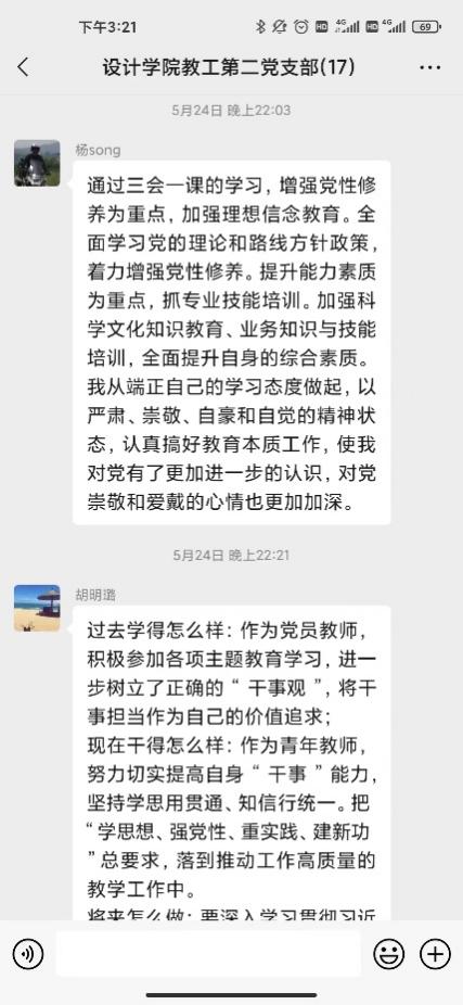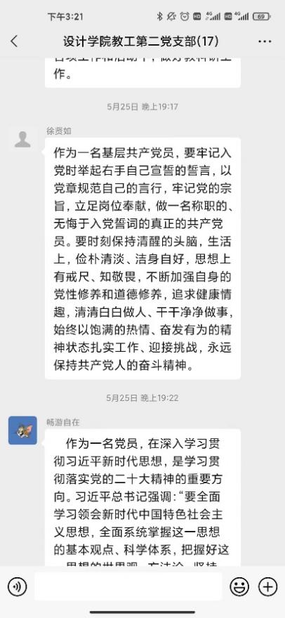 研討會第二環(huán)節(jié)支部黨員針對合實際圍繞“三問”(過去學得怎么樣、現在干得怎么樣、將來打算怎么辦)展開了線上交流研討。黨員教師在支部微信群積極展開研討,深入剖析過去、現在、未來的工作和學習。