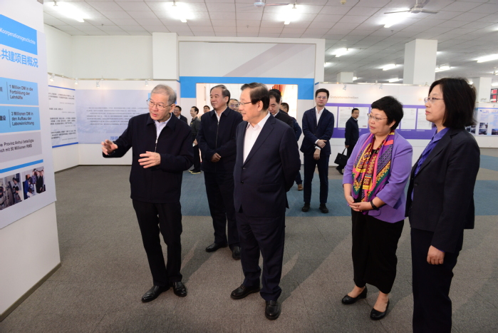 座談會前,萬鋼一行來到大眾學院,詳細了解學?!半p元制”高等教育及產教融合發展情況,并與老師學生深入交流。在參觀中德共建成果展中,萬鋼全面了解學校的發展歷程,鼓勵學校堅持“應用型”辦學定位,培養更多高素質應用型人才。