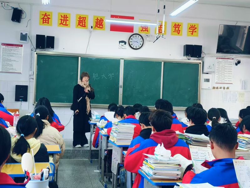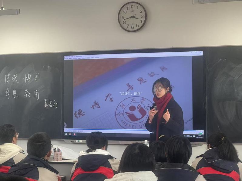 本次活動涉及合肥一中、合肥六中、合肥168中學(xué)等省內(nèi)外28所中學(xué),影響了近千位高中學(xué)生。來自24級新聞1班的夏若彤返回母校阜陽紅星中學(xué),她以介紹合肥大學(xué)的特色與優(yōu)勢為核心,向同學(xué)們展示了大學(xué)生活的魅力,詳細講解了學(xué)校的專業(yè)設(shè)置和課程安排,特別是一些特色專業(yè)和同學(xué)們感興趣的熱門專業(yè)。同時還分享了豐富多彩的校園活動,包括社團、體育賽事、學(xué)科競賽和志愿服務(wù)等內(nèi)容,展現(xiàn)了大學(xué)生活的多元化。在宣講過程中,夏若彤積極與高中生們積極互動,耐心回答他們提出的關(guān)于大學(xué)生活、學(xué)習(xí)規(guī)劃等方面的問題,并結(jié)合自身經(jīng)歷分享了經(jīng)驗。