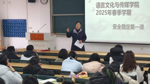 34日中午1210,語言文化與傳媒學院安全教育第一課在一區善思樓C101教室順利舉行。本次活動由語言文化與傳媒學院黨委副書記張愛萍主持,語言文化與傳媒學院團委負責老師竇思佳出席。