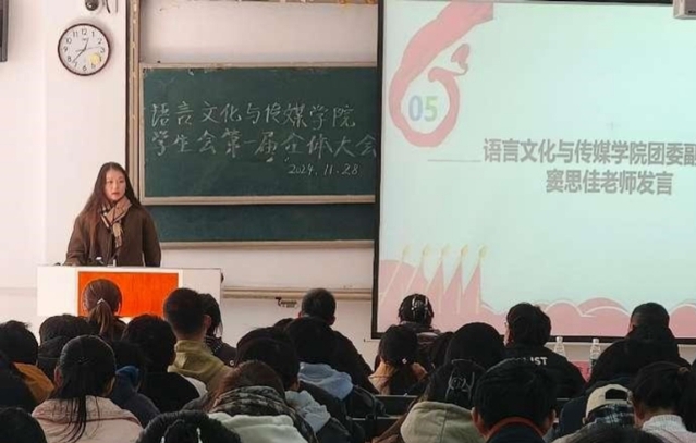 11月28日中午12:15 ,語言文化與傳媒學院第六屆學生會第一次全體大會于一區善思樓C座101教室召開。此次會議由學生會主席張金涵主持,語言文化與傳媒學院團委負責老師竇思佳及學生會全體成員出席。