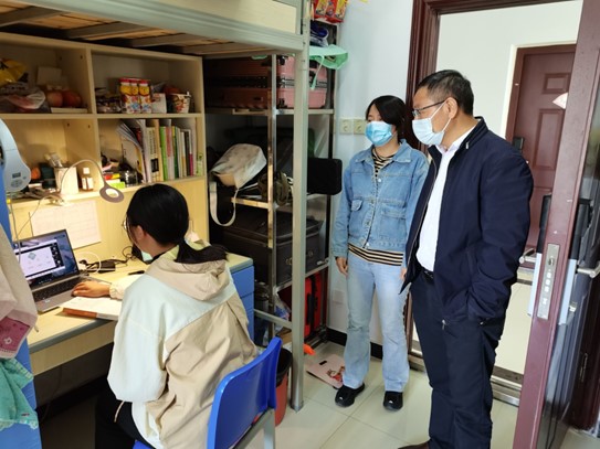 在查看學生線上學習過程中,老師們親切詢問學生上課平臺、網絡是否流暢、是否適應線上教學等情況。同時,儲昭輝對疫情期間學生們的生活情況進行了細致詢問,對寢室網絡安全問題以及如何在疫情期間合理安排時間等問題與學生們進行了深入交談,鼓勵學生們積極配合線上教學工作,以良好的精神面貌,努力完成好特殊時期的學習任務。在深切的交流中,學生們深深感受到領導和老師們的關心。