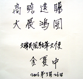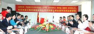 院領(lǐng)導(dǎo)劉立成、蔡敬民、鄭永紅、陳嘯、丁明等首先在主教學(xué)樓2樓會(huì)議室親切會(huì)見金夏中一行。會(huì)見中,副院長(zhǎng)蔡敬民教授向金夏中介紹了我院的辦學(xué)情況特別是我院的中韓合作辦學(xué)情況,指出趙誠(chéng)惠老師為我院對(duì)韓合作辦學(xué)作出的積極貢獻(xiàn)。金大使的到來必將推動(dòng)我院與韓國(guó)高校辦學(xué)的進(jìn)一步發(fā)展,也必將對(duì)提升我院在中韓合作院校的重要地位產(chǎn)生巨大影響。金夏中大使在會(huì)談時(shí)說,合肥學(xué)院是安徽省對(duì)外發(fā)展的一個(gè)重要窗口,我很榮幸來貴校訪問并做演講。此次訪問安徽的目的是進(jìn)一步了解安徽,探討雙方合作與發(fā)展的前景與措施。其次是看望老朋友趙誠(chéng)惠夫婦,感謝她們?yōu)轫n中友誼所做出貢獻(xiàn)。簡(jiǎn)短的會(huì)談結(jié)束后,金夏中大使為我院題詞:“高瞻遠(yuǎn)矚,大展宏圖”。