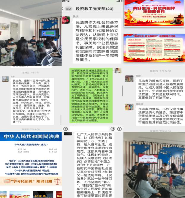 各黨支部通過研讀原文、觀看記錄片短視頻、以案說法、在線分析討論等方式,對《民法典》進行深入學習,黨員們充分領悟了頒布民法典的重大意義,大幅提高了政治站位和法律意識,切實增強了學習貫徹《民法典》的思想自覺和行動自覺。這次集中學習,要求各黨員在日常生活、工作中做到知法于心、守法于行,弘揚社會主義法治精神,營造知法、懂法、守法、用法的社會氛圍。參加學習的黨員紛紛表示:《民法典》作為我國社會的基本法,是民族精神和時代精神的立法表達,《民法典》的頒布和實施,標志著我國法律體系的進一步完善,我國依法治國邁上新臺階。