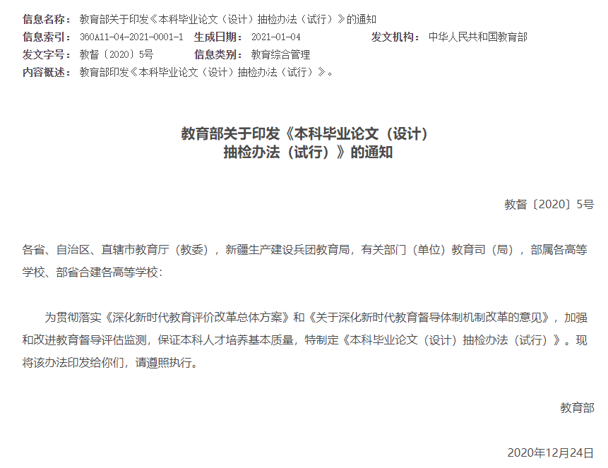 教育部關(guān)于印發(fā)《本科畢業(yè)論文(設(shè)計)抽檢辦法(試行)》的通知