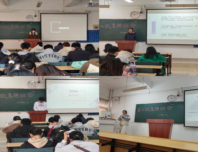 本次班會圍繞三項主題展開,分別是“誠信考試”、“生命安全”和“財產安全”。由漢語言文學專業一班四位班委分別介紹相關主題的知識。首先,第一項主題為“誠信考試”,由班委陸欣悅和楊紫嫣進行演講,強調了誠信考試對于每位學生的重要性,學生對于考試應有的正確態度及誠信考試的相關做法。第二項主題為“生命安全”,班委甘亞男介紹了與學生生活息息相關的交通和食品安全,鼓勵同學們提高身體素質、保持心理健康。最后一項主題是“財產安全”,班會上班委許程林進一步提出了在學生日常生活中維護財產安全,保障財產權益的有效舉措。